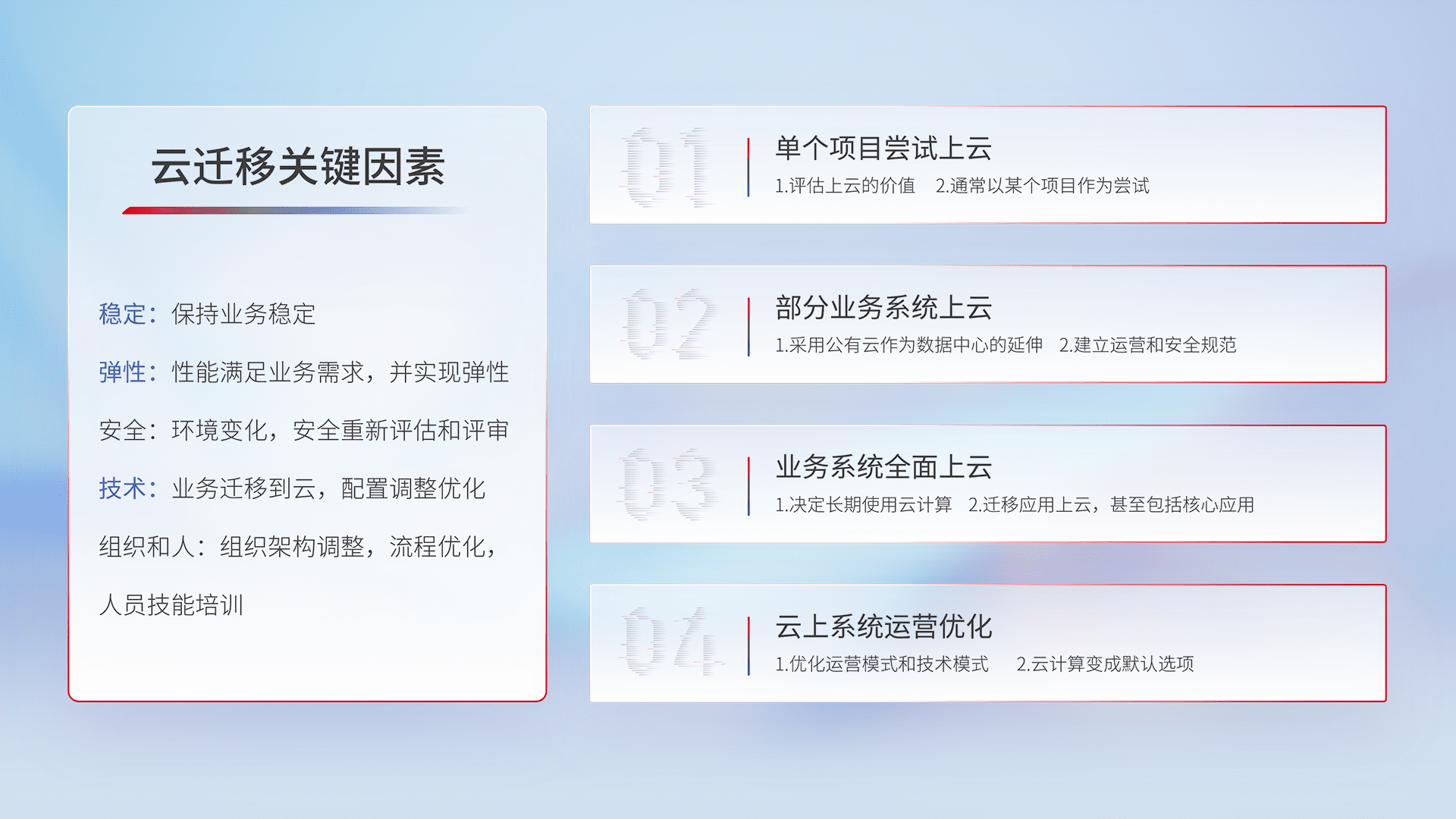 结合实际业务,,,从规划设计、、、、云平台选型、、云原生改造、、数据迁移、、、集成交付,,,,迁移全过程为客户识别最佳上云路径,,,做好风险识别管理,,设计网络架构、、身份权限、、、、安全审计合规、、、、操作审计、、日志审计、、、监控告警策略、、、、多站点容灾设计等,,,,对云上基础设施进行整体规划,,,提升IT治理水平,,以满足弹性、、、高可用、、高性能的需求。。